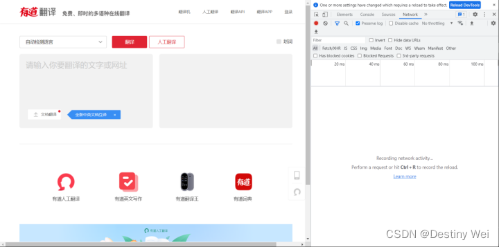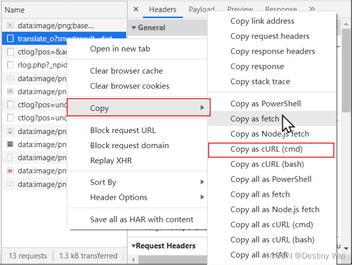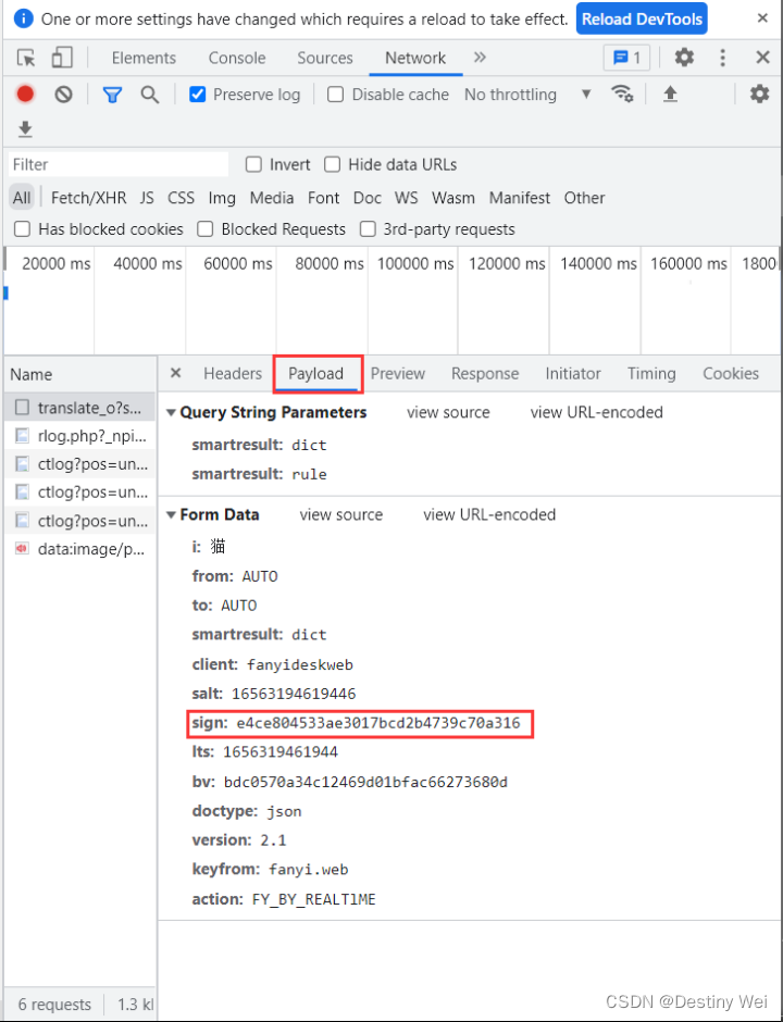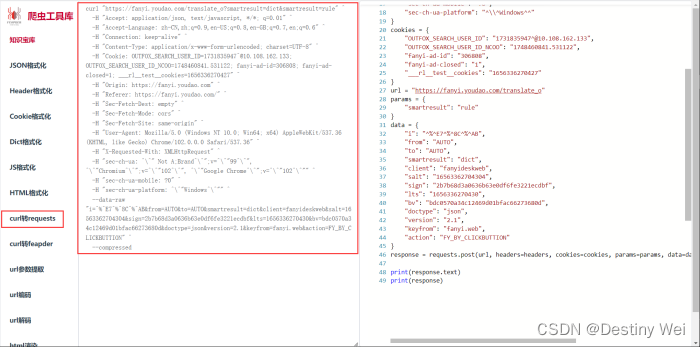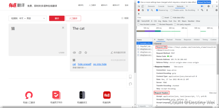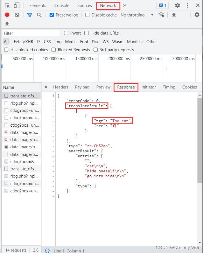 这里需要注意的是,浏览器中返回的都是 json 格式,所以我们需要返回开发者工具中找到我们所需要的翻译返回值