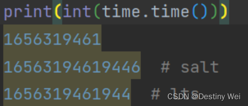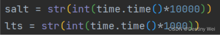 salt 则是时间戳,此时我们通过打印 “int(time.time())” (注:python中 time.time() 函数为浮点数) 与Request Headers中的 salt 和 lts(其形式也与时间戳相似) 进行比较