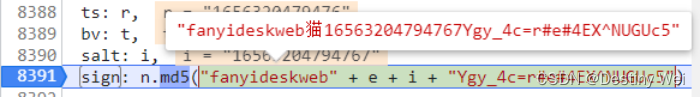 从这我们可以知道 “e” 代表我们想要翻译的具体内容,而 “i” 从我们的经验可以判断出其应该是时间戳,至此我们可以知道 sign 加密的所有具体内容
