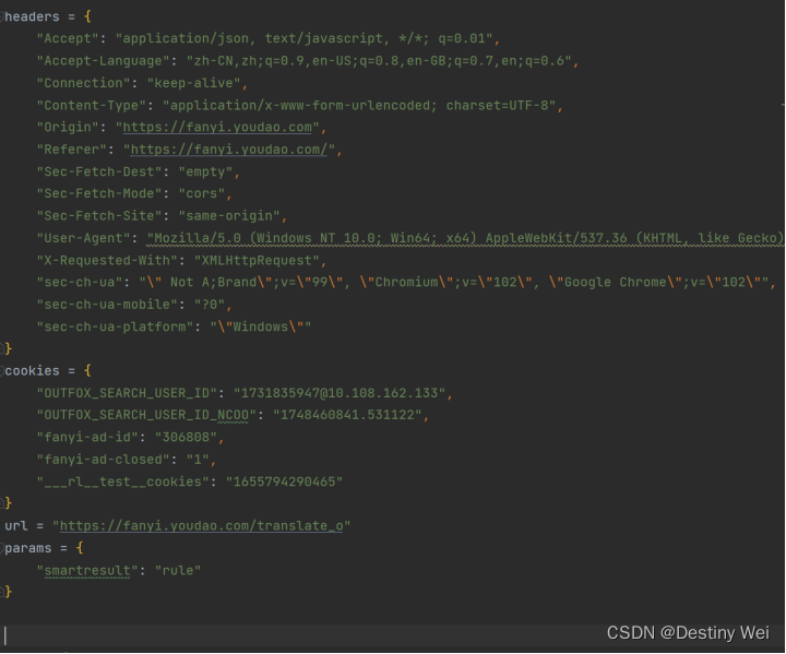 注意:cookies包含在Request Headers中,我们需要单独把它复制出来。