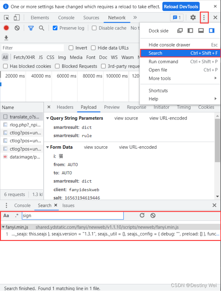 然后我们点击开发者工具右上角三个点中的Search功能(或按 Ctrl + Shift + F) 搜索 sign 关键字