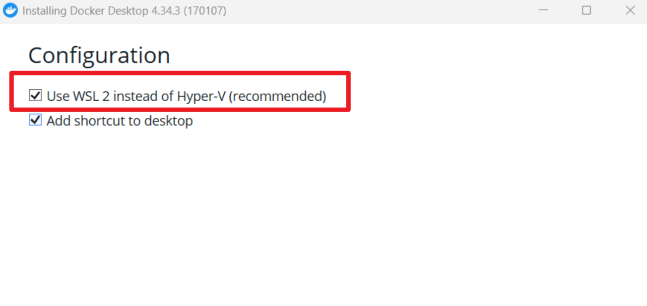 第二步:根据安装提示进行安装。注意: 在安装过程中,会提示安装 WSL 2,勾选此选项:
