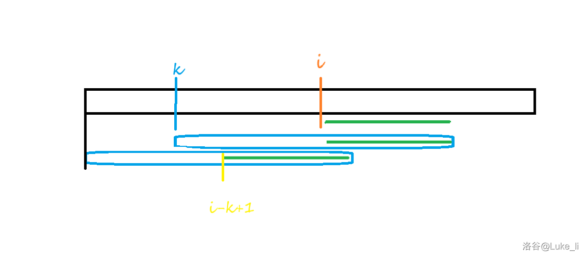 如果 \(k+f_k-1\ge i\),那么如图所示。蓝色线段代表 \(k\) 位置的后缀对应的 LCP,显然图中所有绿色线段对应的字符串是相等的。由于 \(i-k+1\) 位置的后缀和 \(i\) 位置的后缀具有相同前缀,我们可以借用 \(f_{i-k+1}\) 的值。