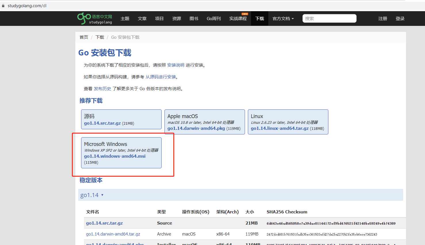 下载地址:https://studygolang.com/dl (Go语言中文网),下载msi安装版,一路next就OK