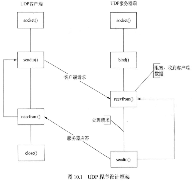 UDP 协议的程序设计框架如图 10.1 所示,客户端和服务器之间的差别在于服务器必须使用 bind() 函数来绑定侦昕的本地 UDP 端口,而客户端则可以不进行绑定,直接发送到服务器地址的某个端口地址。