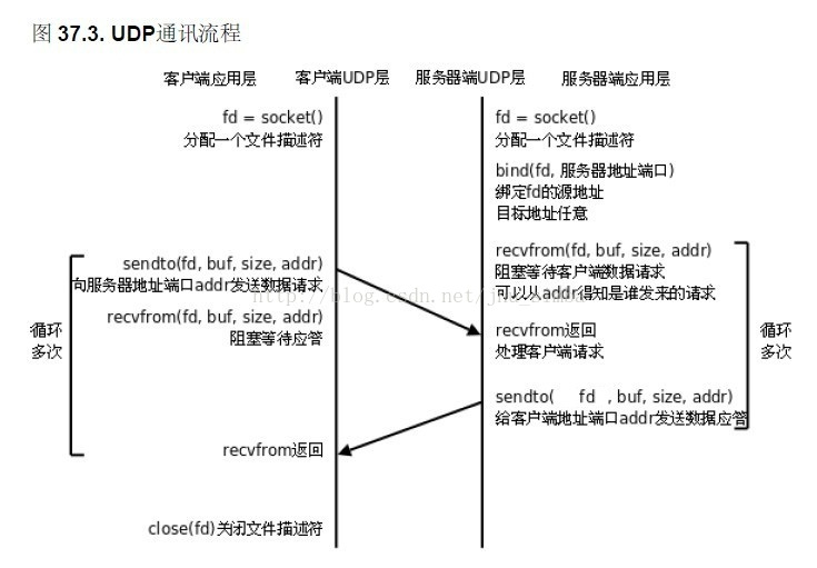建立套接字过程使用socket()函数,这个过程与TCP协议中的含义相同,不过建立的套接字类型为数据报套接字。地址结构与套接字文件描述符进行绑定的过程中,与 TCP 协议中的绑定过程不同的是地址结构的类型。 当绑定操作成功后,可以调用 recvfrom() 函数从建立的套接字接收数据或者调用 sendto() 函数向建立的套接字发送网络数据。 当相关的处理过程结束后,需要调用 close() 函数关闭套接字。