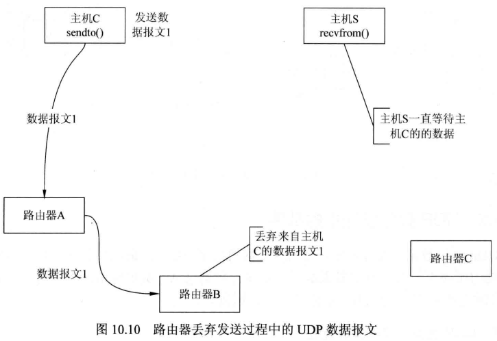 当路由器要对转发的数据进行存储、处理、合法性判定、转发等操作,容易出现错误,所以很可能在路由器转发的过程中出现数据丢失的现象,如图 10.10 所示。当UDP的数据报文丢失的时候,函数recvfrom()会一直阻塞,直到数据到来。