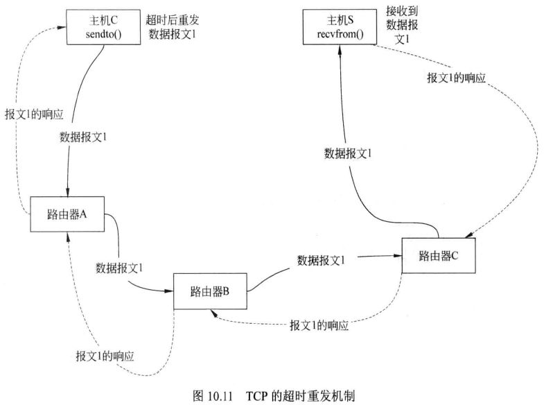 UDP协议中的数据报文丢失是先天性的,因为UDP是无连接的、不能保证发送数据的正确到达。图10.11为TCP连接中发送数据报文的过程,主机C发送的数据经过路由器,到达主机S后,主机S要发送一个接收到此数据报文的响应,主机C要对主机S的响应进行记录,直到之前发送的数据报文1已经被主机S接收到。 如果数据报文在经过路由器的时候,被路由器丢弃,则主机C和主机S会对超时的数据进行重发。