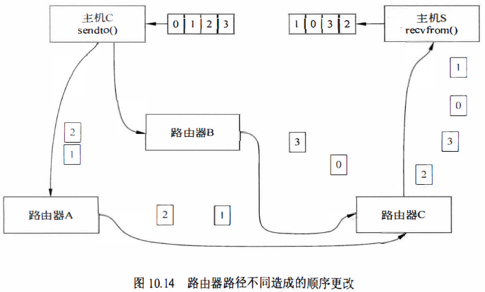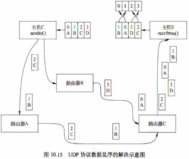 由于路由器的存储转发可能造成数据顺序的更改,UDP协议的数据经过路由器时的路径造成了发送数据的混乱,如图10.14所示。从主机C发送的数据0123,其中数据0和3经过路由器B、路由器C到达主机S,数据1和数据2经过路由器A和路由器C到达主机S,所以数据由发送时的顺序0123变成了顺序1032。