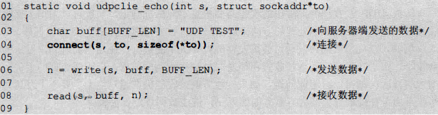 下面是一个使用 connect()函数的例子,在发送数据之前,将套接字文件描述符与目的地址使用 connect()函数进行了绑定,之后使用 write()函数发送数据并使用 read() 函数接收数据。