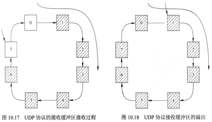 如图 10.16 所示为 UDP 的接收缓冲区示意图,共有8个缓冲区,构成一个环状数据缓冲区。起点为0。当接收到数据后,会将数据顺序放入之前数据的后面,并逐步递增缓冲区的序号,如图 10.17所示。当数据没有接收或者接收数据比发送数据的速率要慢, 之前接收的数据被覆盖,造成数据的丢失,如图10.18所示。