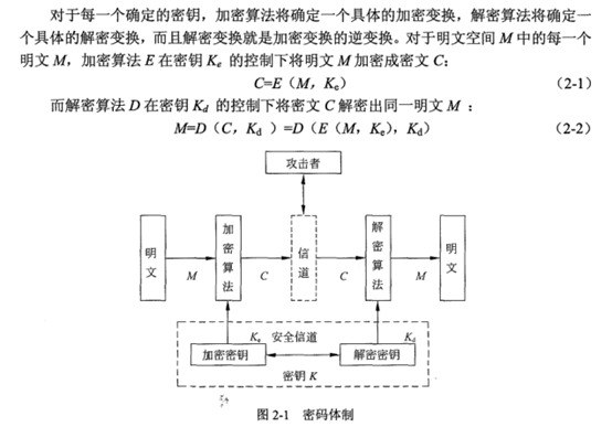 显然,若Kd = Ke,称为单密钥密码体制或者对称密码体制或者传统密码体制。否则为双密钥体制,进而,若Kd不能由Ke 推出,就可将Ke公开且不会损害Kd的安全,这种密码体制称为公开密钥密码体制,简称公钥密码体制