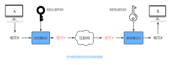 在非对称密码体制中,每个用户都具有一对密钥,一个用于加密,一个用于解密,其中加密密钥可以公开,称之为公钥,解密密钥属于秘密,称之为私钥,只有用户本人知道。