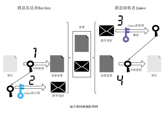 4、James收到Harden的加密消息和数字信封后,先用自己的私钥将数字信封解开获取对称密钥
