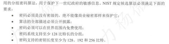 1997年美国国家标准技术研究所(NIST)发起征集AES(Advanced Encryption Standard,高级加密标准)算法的活动,成立AES小组