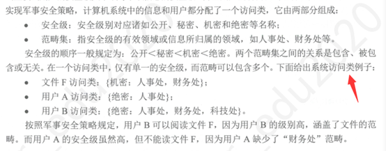 可用于军事安全策略,其策略规定,用户要合法读取某信息,当且仅当用户的安全级大于或等于该信息的安全级,并且用户的访问范畴包含该信息范畴