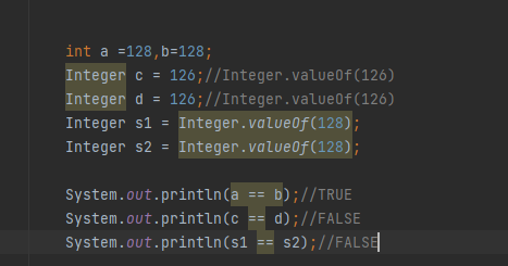 -128 到 127 之间的数会从 IntegerCache 中取,然后比较,所以126的结果是 true,而第三段代码(128 不在这个范围之内,所以 new 出来了两个 Integer 对象)的结果是 false。