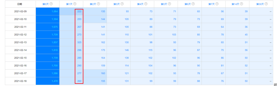 *图为华为分析-留存分析报告中留存人数详情,数据为虚拟