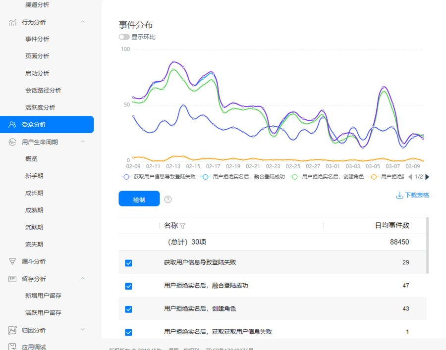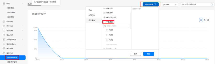 分析服务中留存分析功能可随时随需生成分析报告,你可以通过过滤器功能,选择你想要了解的渠道数据,并且可以根据日、周、月查看不同时间段用户的新增和留存情况。这样就可以快速评估渠道的质量。对于新增用户留存率越高的渠道,你可以增加投放资源,把“钱花在刀刃上”。