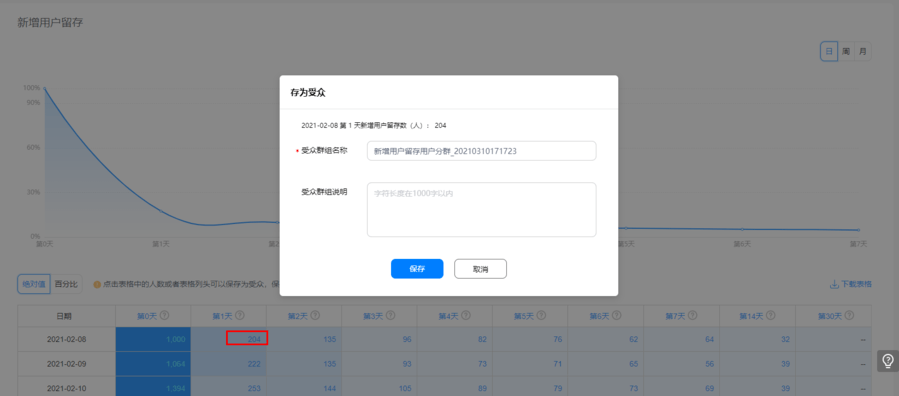 我们可以从圈定用户、分析用户行为这两个步骤进行。首先,留存分析报告可将留存用户一键存为受众。