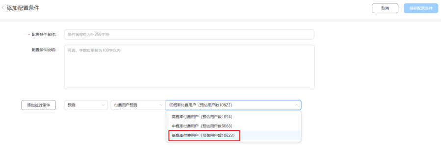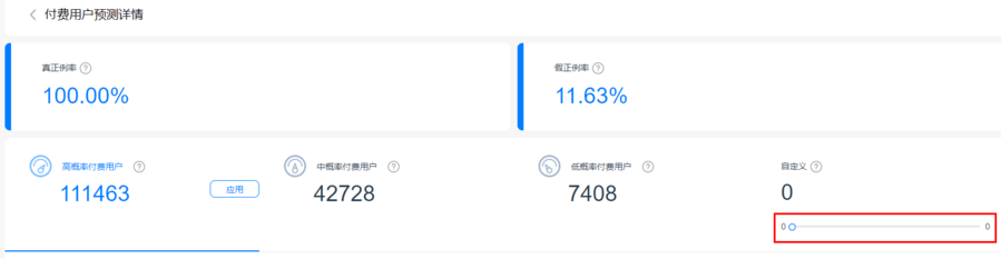 系统默认按照未来一周内付费事件产生的概率将近一周活跃用户分为高(>70%)、中((20%,70%])、低(≤20%)三个不同受众组。当然,也可以根据实际游戏和玩家特点,比如,定义概率区间为50%-70%的中高概率付费人群,自定义概率区间。