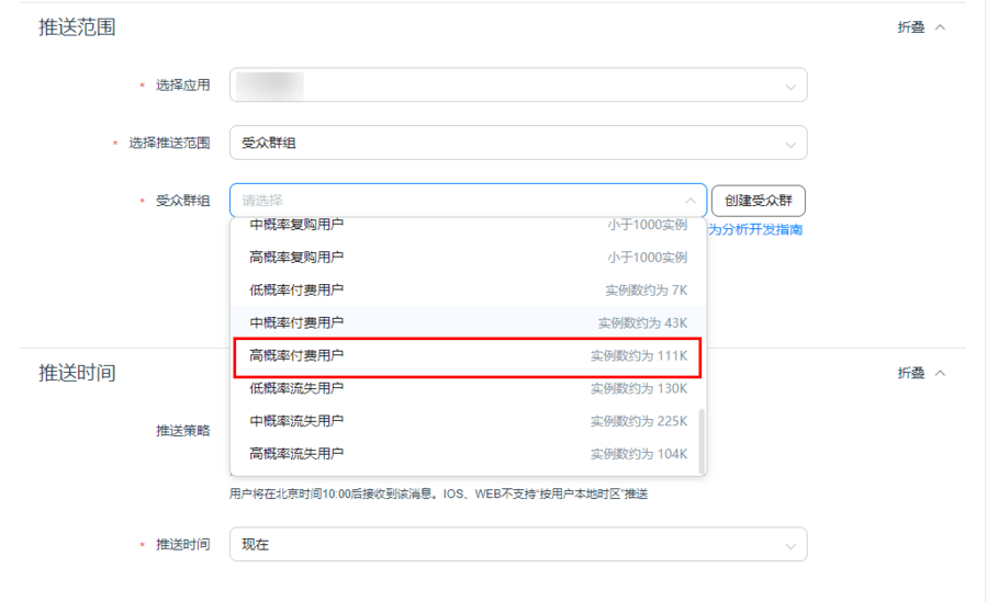 上述分层分群的运营方式十分便捷,在后台配置消息推送范围时,直接圈选即能实现目标人群的定向推送。