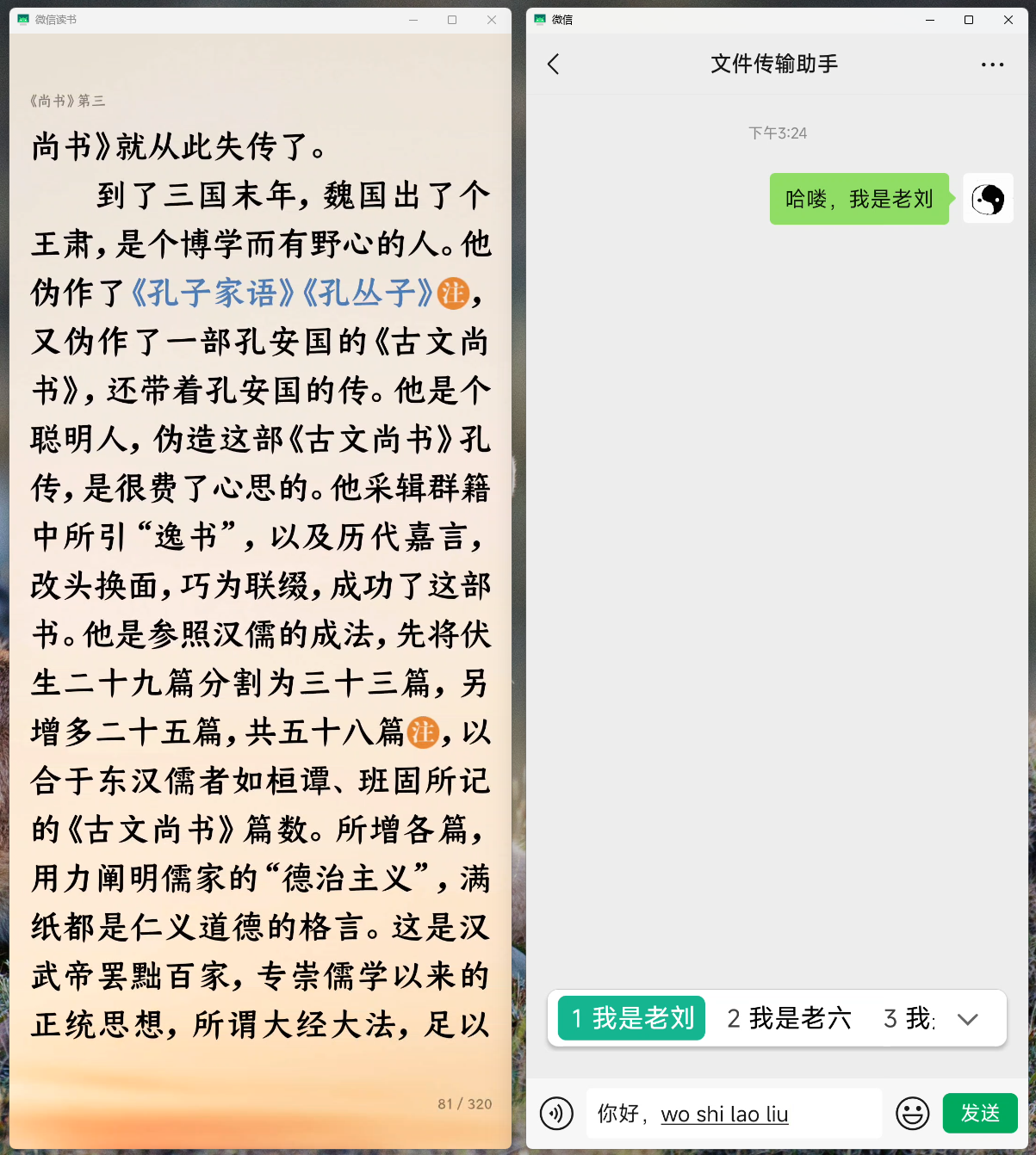 在一个窗口中打开阅读应用,同时在另一个窗口中打开聊天应用。