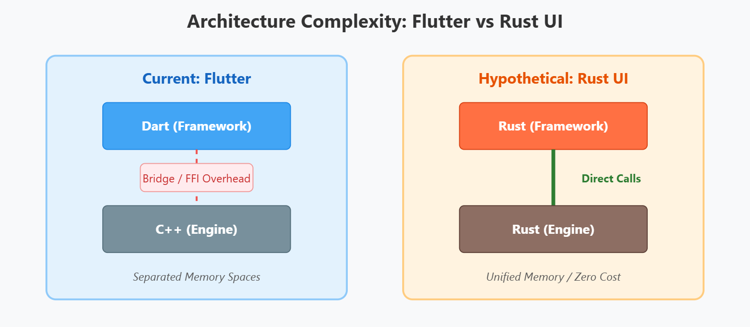 现实世界里更合理的做法是使用Dart这类高级语言作为UI主栈,同时在需要的地方把性能关键模块用Rust(或C++)实现,通过FFI嵌入。