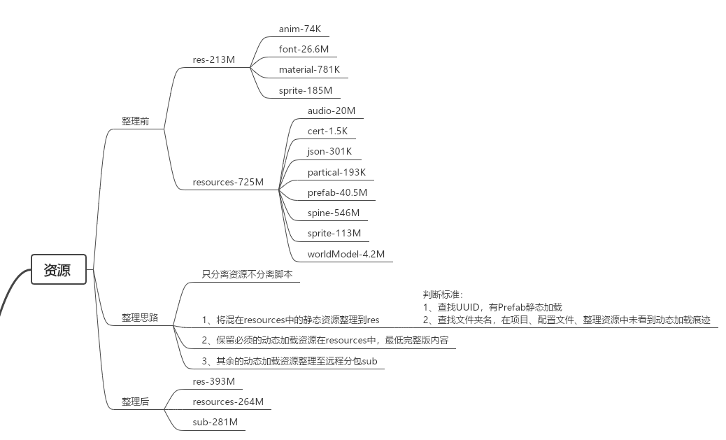 分离动态资源则是写了一个组件,在项目的动态加载资源代码中添加我的方法,记录动态加载过的资源。首先记录玩家在创建角色前会用到的资源,比如各种音效、图集、选择服务器页面、创角页面等等,这一部分是要在包内的资源,记录至create.json中。再继续操作跑完新手引导,此时动态加载过的资源记录在task.json中,显然task.json的内容是包含create.json的。此时再通过一个脚本来分离动态资源,只处理我想要处理的文件夹,主要是spine和sprite相关的,在这些文件夹中遍历资源,在create.json中的不动;在task.json且不在create.json中的,移动至subPre分包;不在task.json中的,则移动至sub分包。