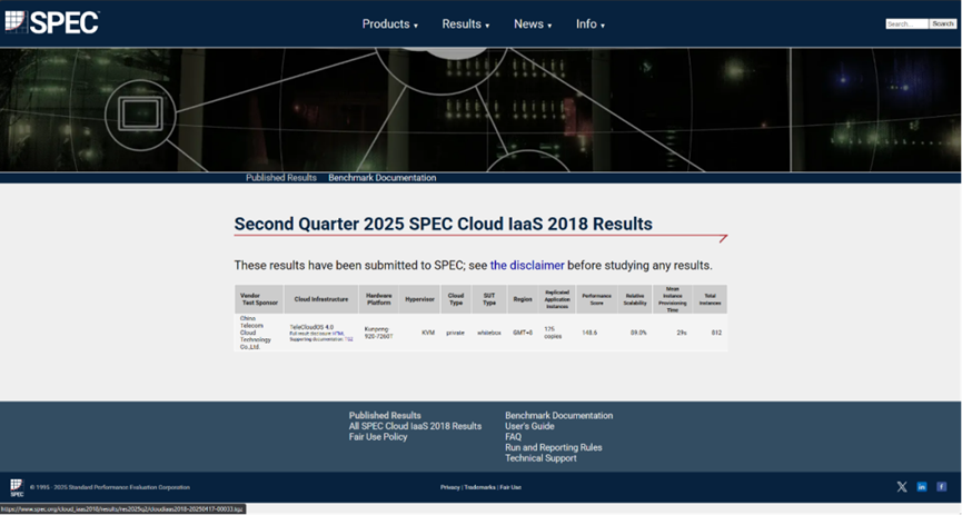 近日,国际权威标准性能评测组织SPEC(Standard Performance Evaluation Corporation,即国际标准性能评测组织)发布最新Cloud IaaS 2018 Benchmark测试结果,天翼云TeleCloudOS 4.0云平台再展卓越技术实力,在9台组测试规模下,以总分148.6的成绩刷新历史最高纪录,荣获全球第一名。