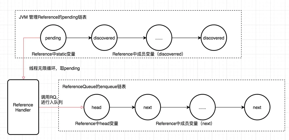 - tryHandlePending:循环处理pending链表头,维护discovered链表,如果pending不为空,则进行插入ReferenceQueue进行后续操作。(这里如果是cleaner,则先进行clean操作)