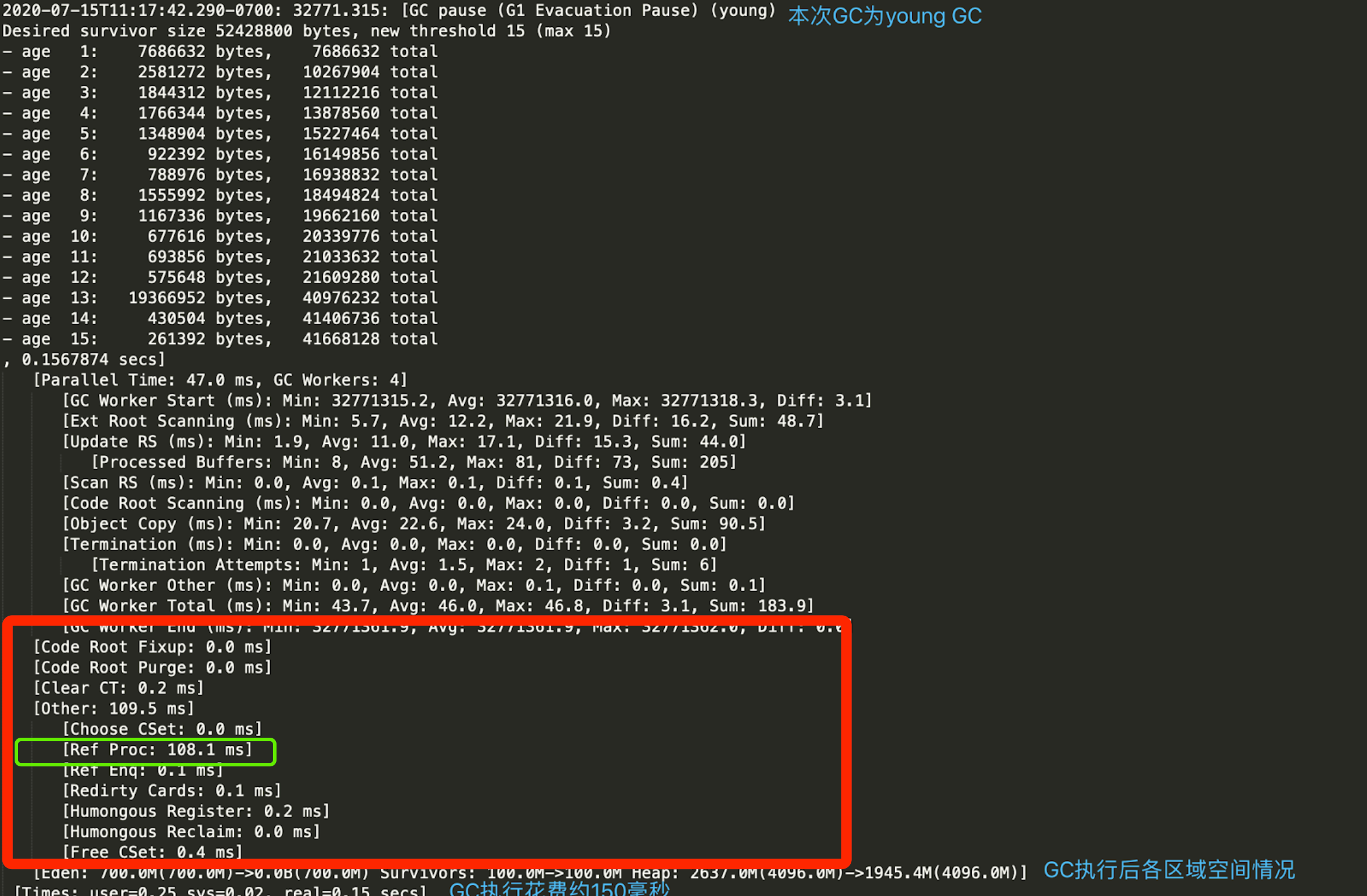 继续观察日志,可以发现,总共150ms的执行过程中,仅Ref Proc一步就花费了108ms。那么可以判断,多出来的时间,应该是和Ref Proc 有关了。Ref Proc这一步就来处理这些引用对象。默认是由单线程执行,如果这一步花费的时间较长,可以通过加参数-XX:+ParallelRefProcEnabled改为多线程处理。