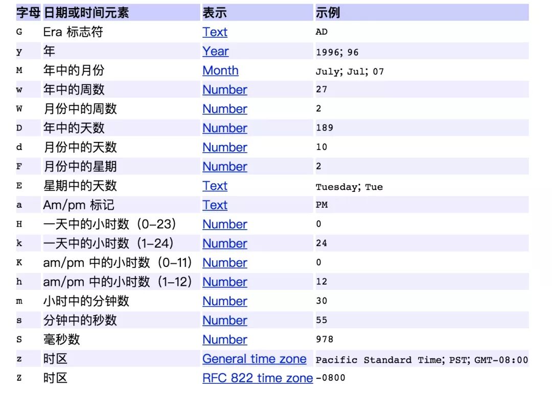 在使用SimpleDateFormat的时候,需要通过字母来描述时间元素,并组装成想要的日期和时间模式。常用的时间元素和字母的对应表如下: