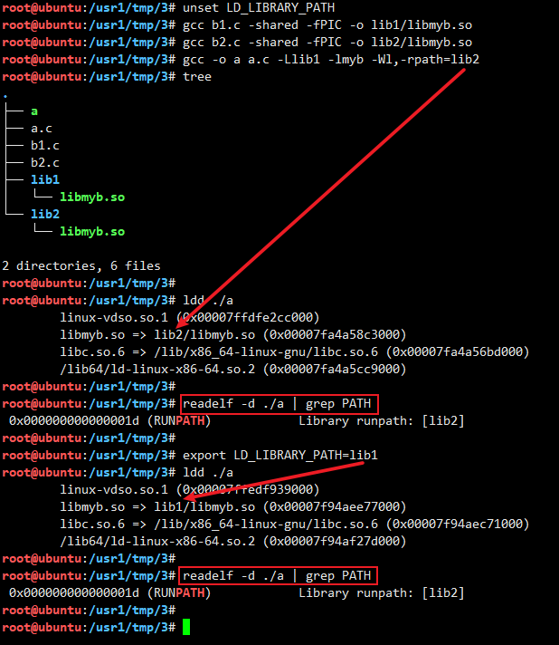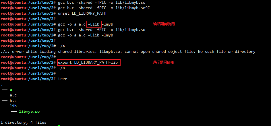 root@ubuntu:/usr1/tmp/2# gcc b.c -shared -fPIC -o lib/libmyb.so