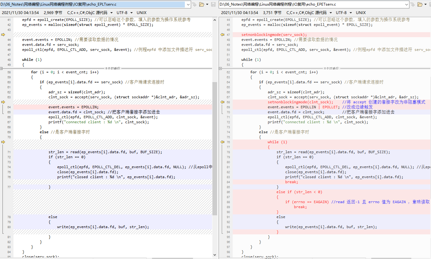 epoll默认是水平触发模式。边沿触发ET相比于水平触发LT,改动的地方主要有2处: