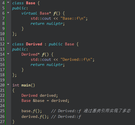 base.h(1); // Base::h 基类引用没有实现动态多态