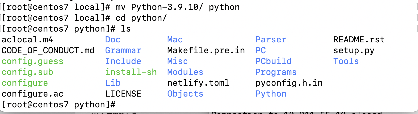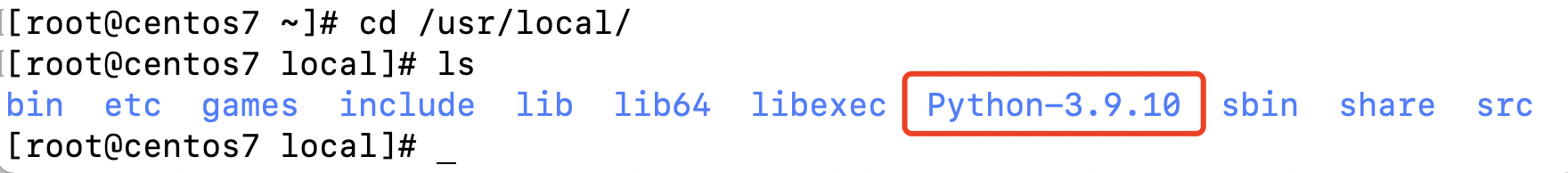 使用 cd 命令切换至 /usr/local/ 下,使用 ls 可以看到有一个 Python-3.9.10 的目录,这就是我们刚刚解压出来的文件目录