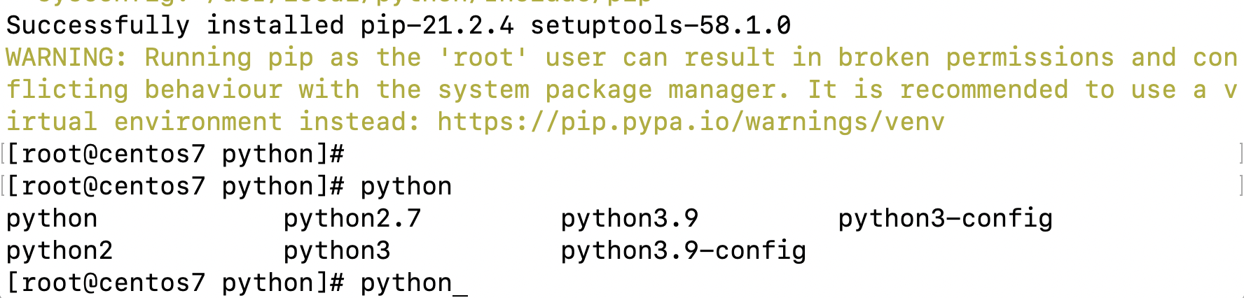 出现这样的效果就说明我们安装成功了,在终端输入python,然后使用table键就可以看到所有以python开头的命令了