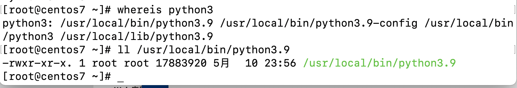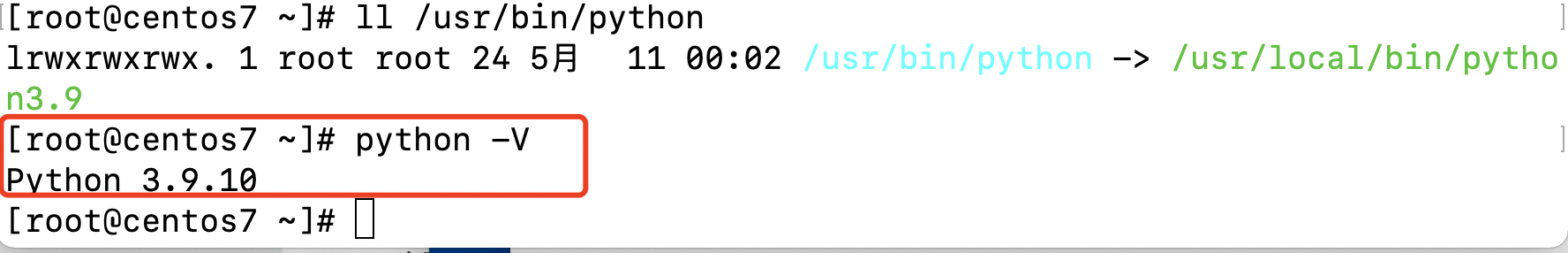 使用 python3 -V 查看版本,可以看到正是我们安装的3.9.10版本