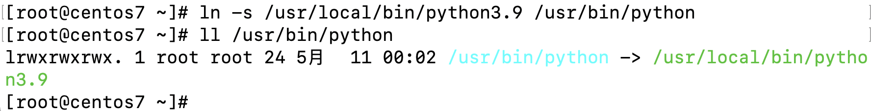 使用ln命令创建新的连接文件,使/usr/bin/python指到我们的python3文件
