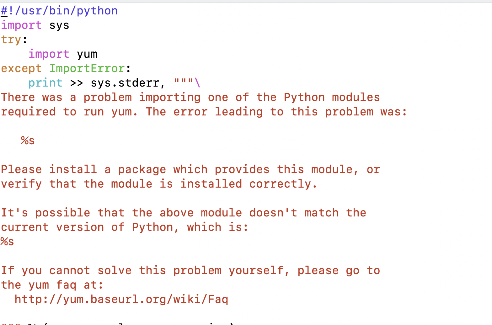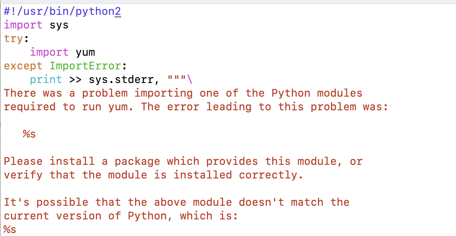 通过报错我们可以知道,这是/usr/bin/yum这个文件有问题,我们使用vim或者vi编辑器打开这个文件