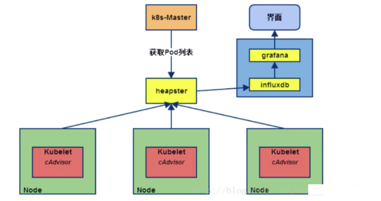 而后出现了第二代,算是第一代的改良版,可以对数据进行汇总。典型代表有 Heapster + InfluxDB + Grafana。其中,Heapster 负责调用各 node 中的 Cadvisor 接口,对数据进行汇总,然后导到 InfluxDB,可以从 cluster、node、pod 各个层面提供详细的资源使用情况。