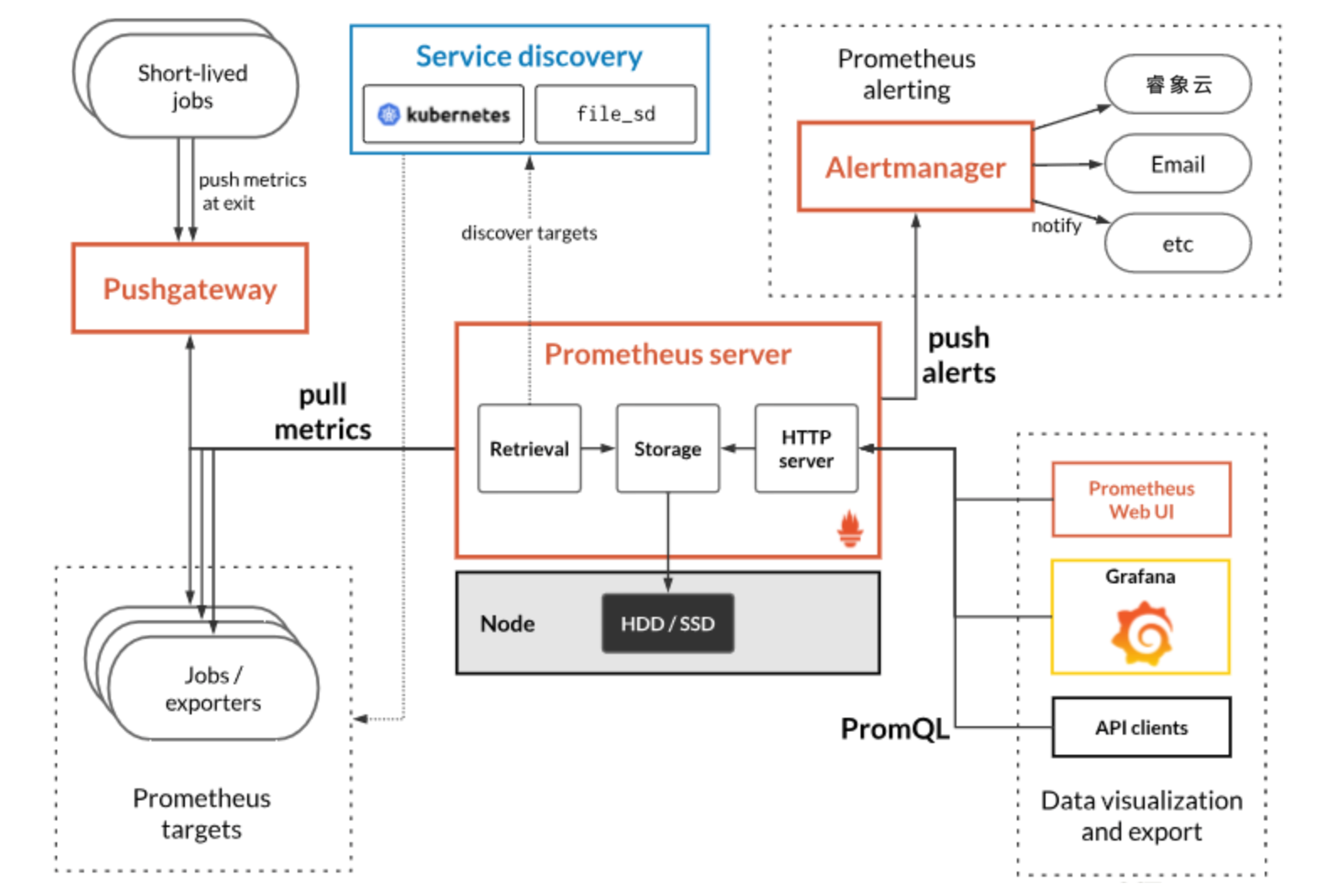prometheus 直接或通过pushgateway抓取数据。将数据存储在本地,并对这些数据运行规则,以便从现有数据聚合和记录新时间序列,或者生成警报。然后利用 grafana 等工具可视化数据。