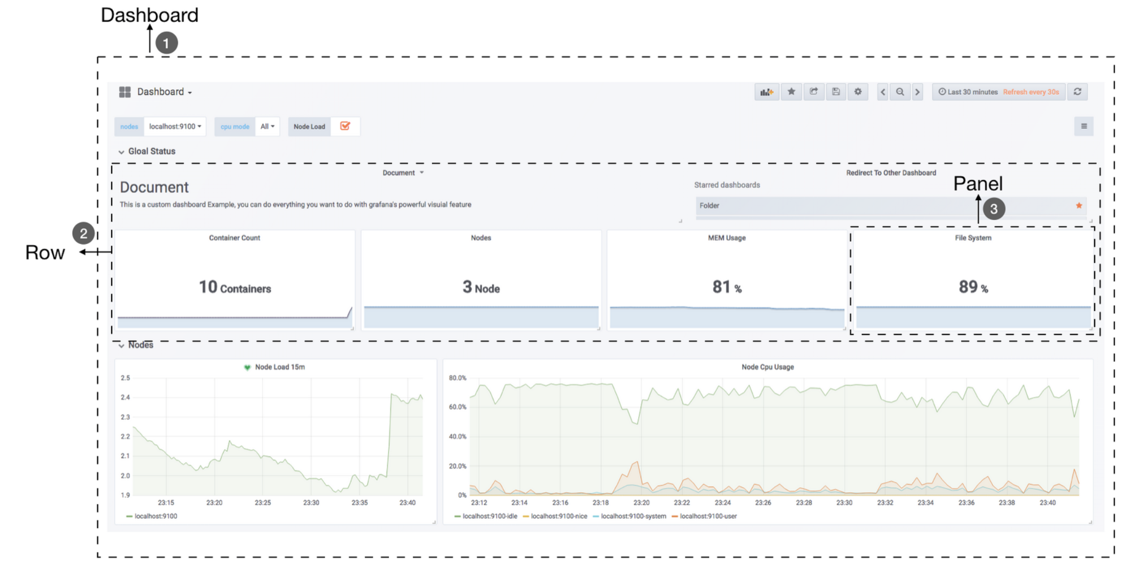 Row:DashBoard 的基本组成单元,一个 DashBoard 可以包含很多个 row 。一个 row 可以展示一种信息或者多种信息的组合,比如系统内存使用率,CPU五分钟及十分钟平均负载等。所以在一个DashBoard上可以集中展示很多内容。