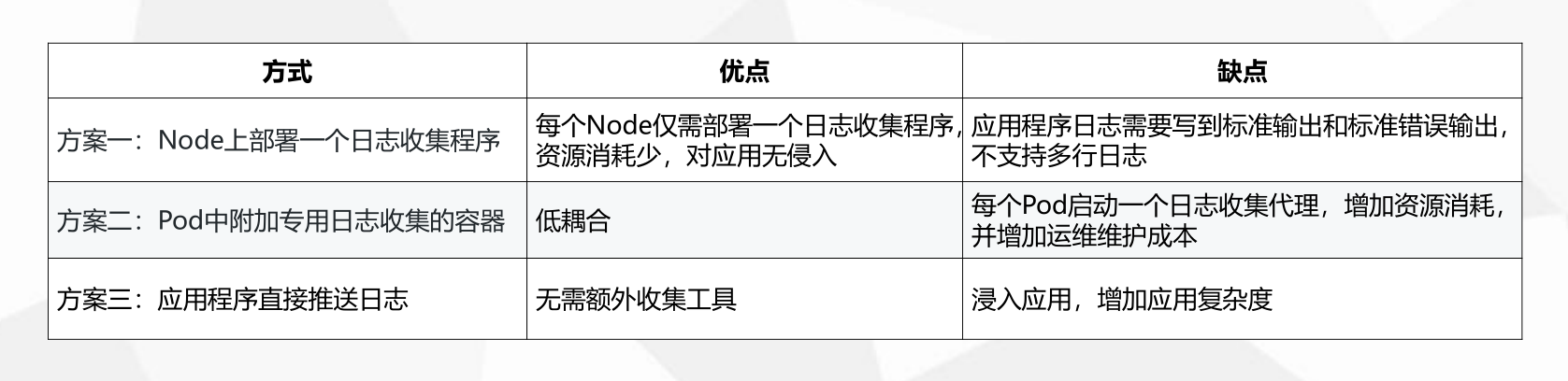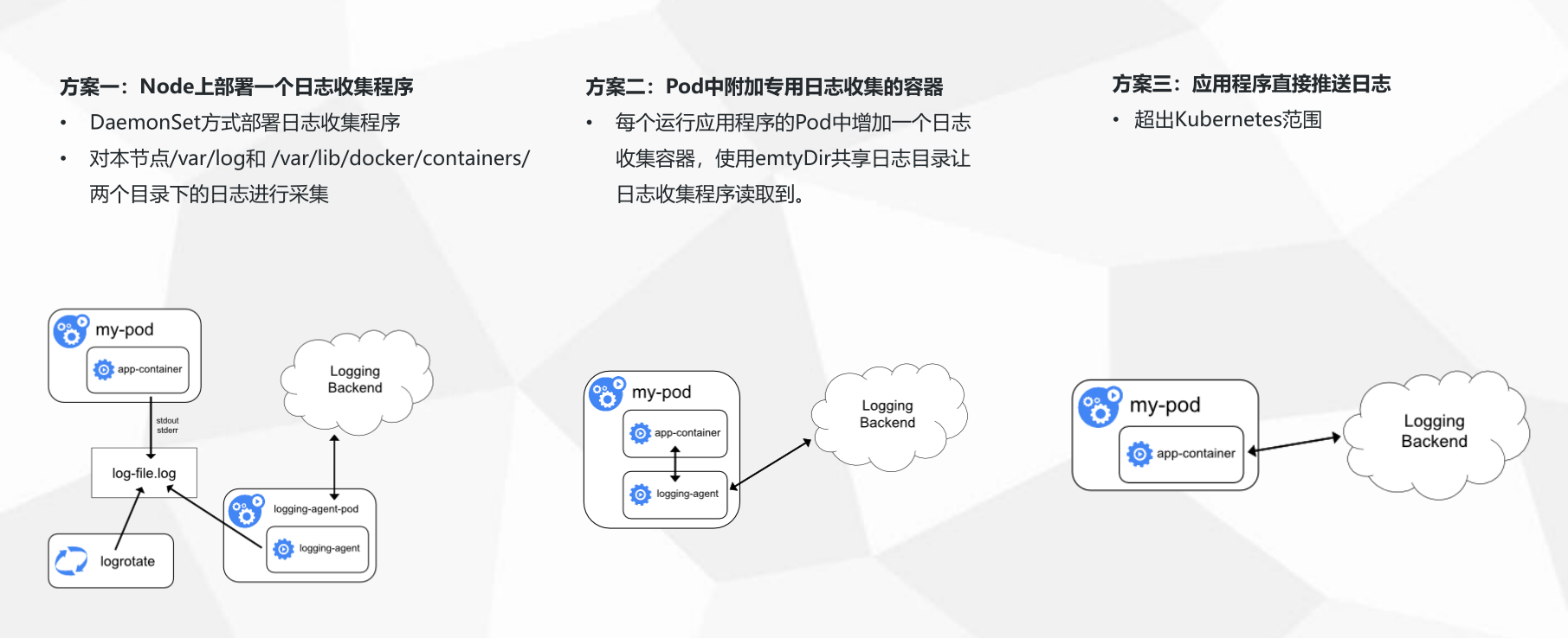 在日常k8s的使用中,由于应用都是运行在pod中的,所以日志文件也一般都会存储在pod中,那如何收集这一块的日志内容?K8S官方给了以下三种方案。