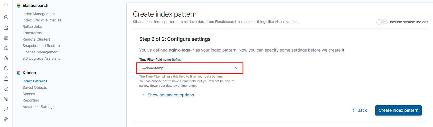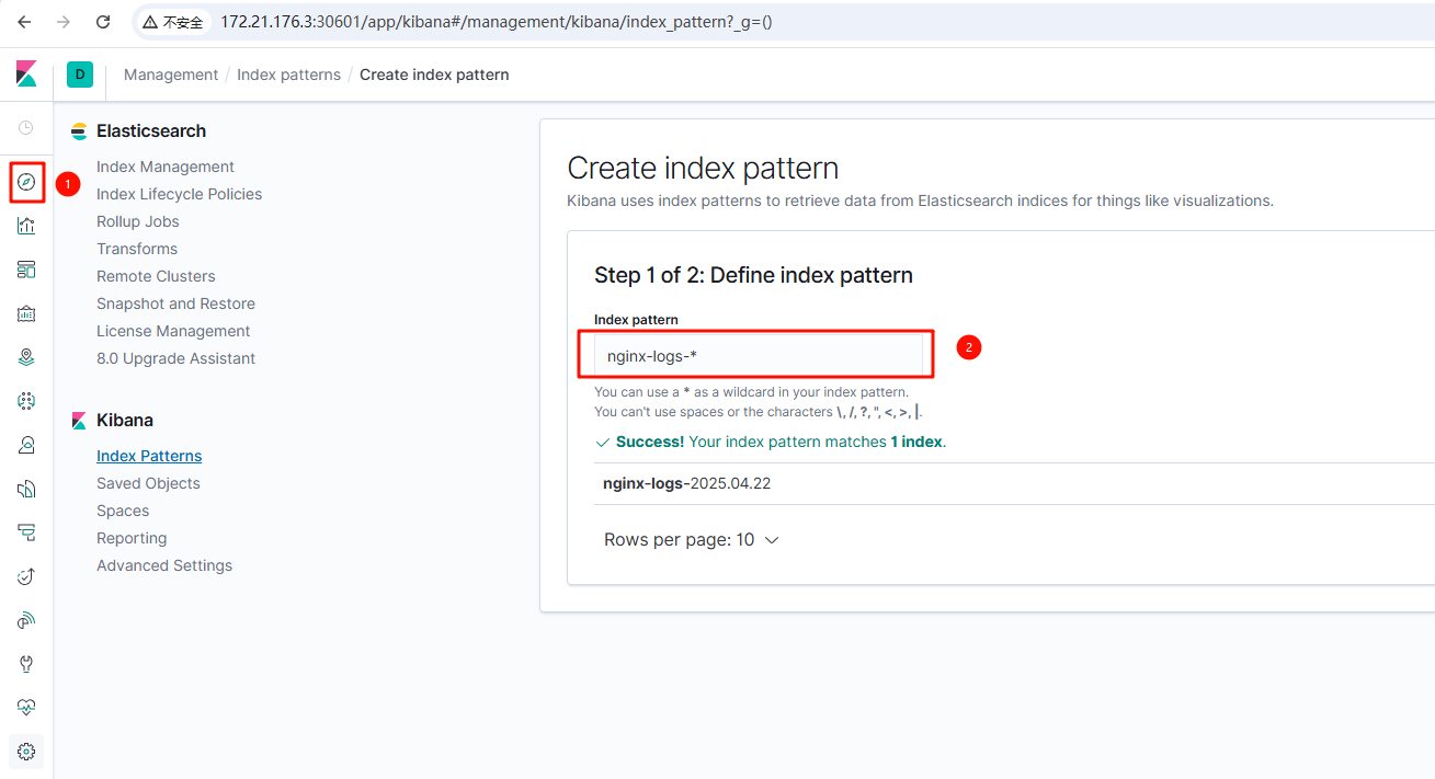 1. 登录kibana,点击左上角的discover,出来的页面右侧创建索引模式,输入nginx-logs-*,这样可以匹配所有以nginx-logs- 开头的日志