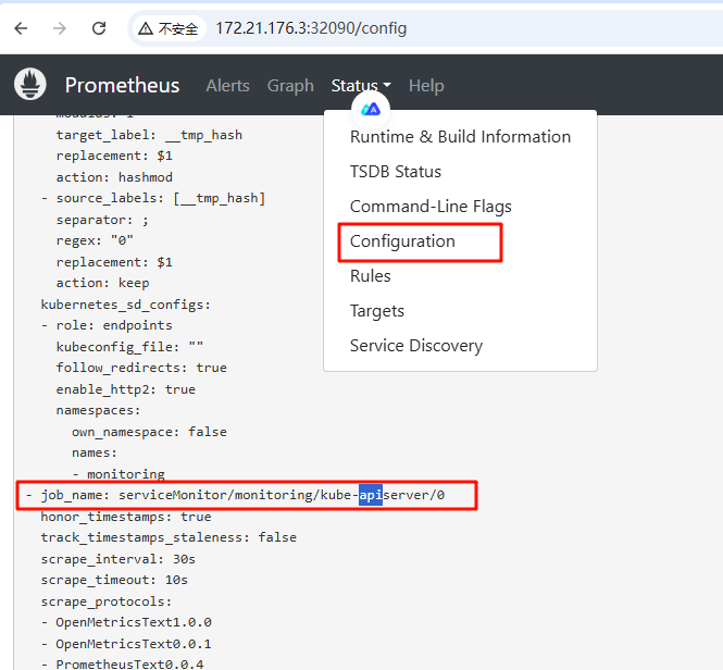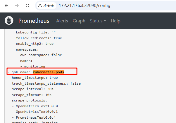 上面的配置除了在serviceMonitor文件中可以看到,也可以在web页面的config页面查看到,那我们大概能明白是需要增加一个job_name,然后匹配不同规则的正则需求。这些不同对象的需求在官网上可以看到。接下来就实际操作新增pod的自动发现和svc的自动发现。