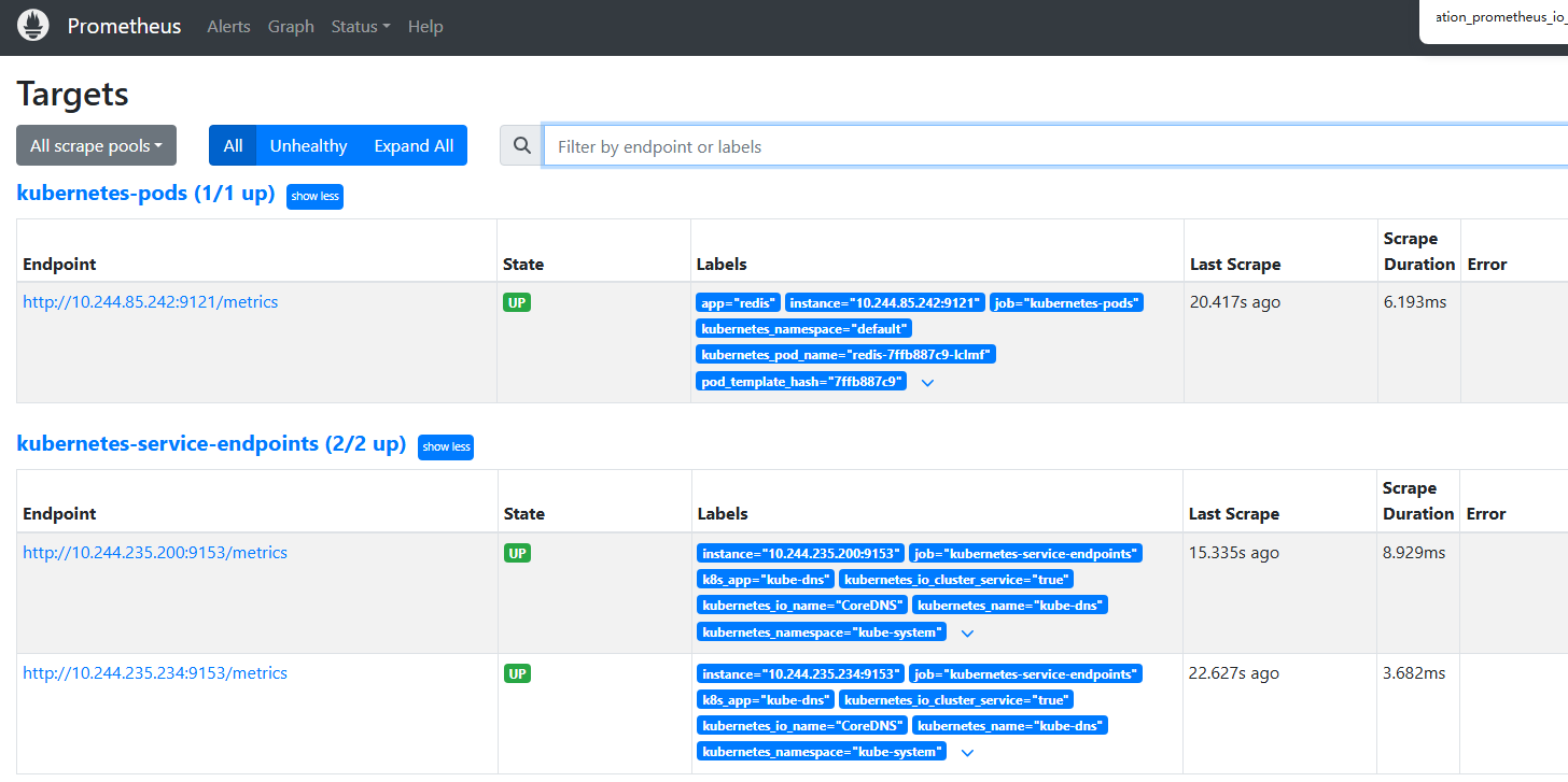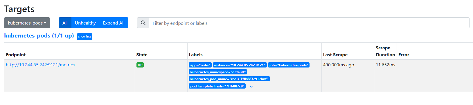 再次去在 Prometheus Dashboard的targets页面,已经可以发现刚才监控的redis监控项了。