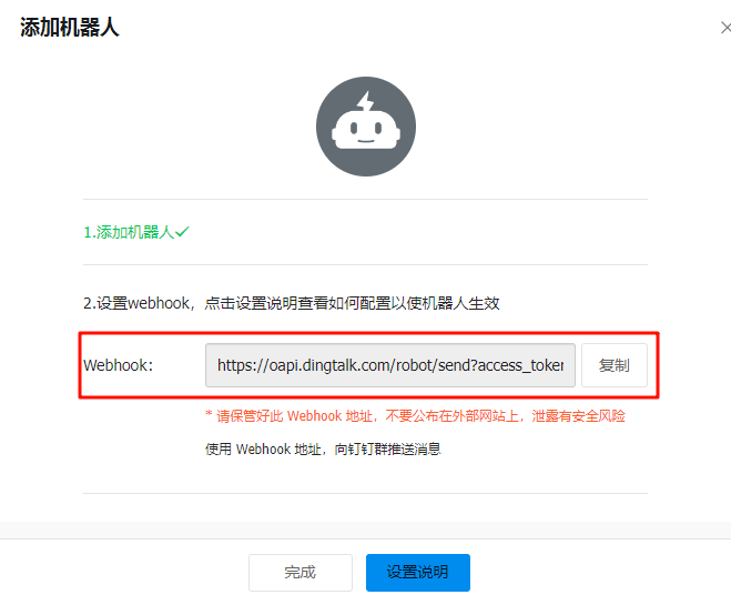 1.2、记录生成的 Webhook URL(如 https://oapi.dingtalk.com/robot/send?access_token=xxx)和加签密钥(如有)。