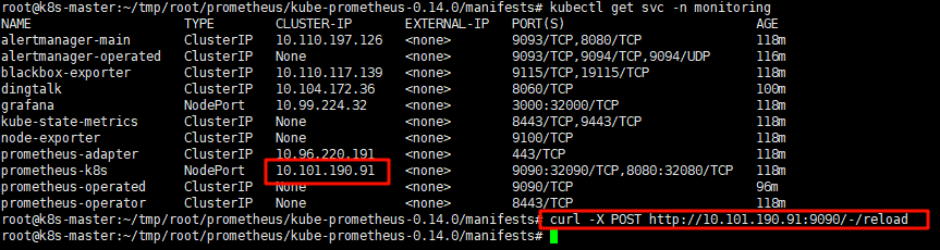 curl -X POST http://<SVC下prometheus-k8s的IP>:9090/-/reload # 热加载配置
